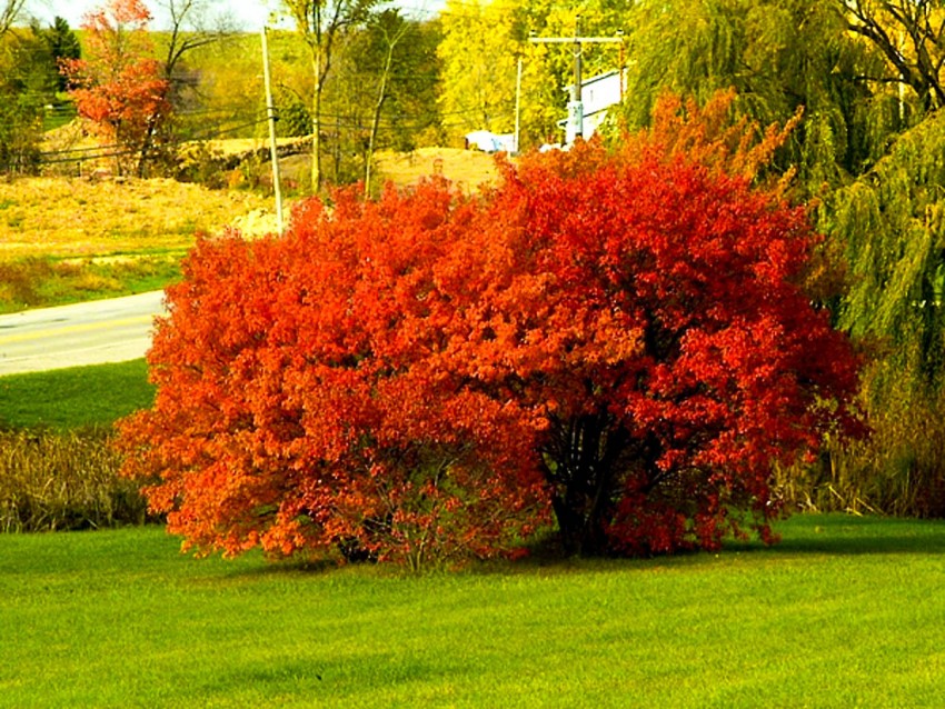 - Листья: Листья трёхлопастные, зелёные летом и ярко-красные осенью, создают эффектный контраст.